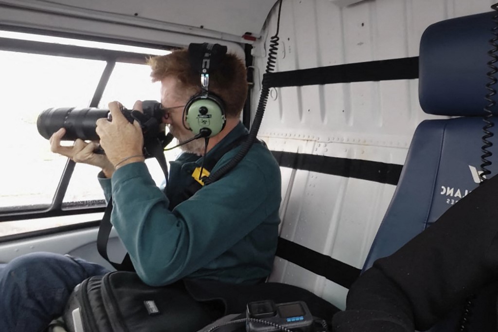 مصوّر وكالة فرانس برس ليونيل بونافنتور يلتقط صورة من مروحية، في 26 تموز/يوليو 2024 في باريس، خلال حفل افتتاح الألعاب الأولمبية في باريس 2024. © إيان لانغسدون / أ ف ب