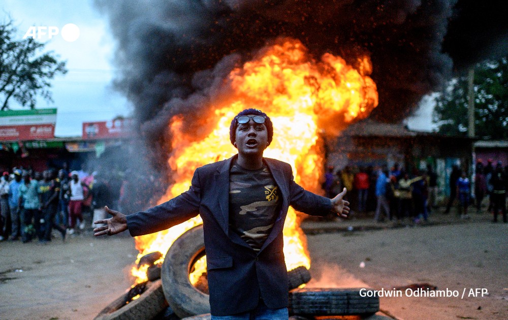 A supporter of Kenya's Azimio La Umoja Party (One Kenya Coalition Party) presidential candidate Raila Odinga gestures past a fire during a protest against the results of Kenya's general election in Kibera, Nairobi, western Kenya on August 15, 2022. The head of Kenya's election body on August 15, 2022 declared Deputy President William Ruto the winner of the country's close-fought presidential election, despite several commissioners rejecting the results. Independent Electoral and Boundaries Commission chairman Wafula Chebukati said Ruto had won almost 7.18 million votes (50.49 percent) against 6.94 million (48.85 percent) for his rival Raila Odinga in the August 9 vote.