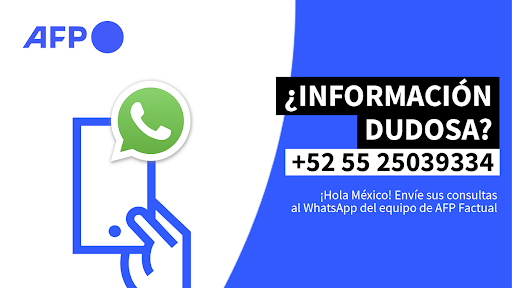 Estas líneas WhatsApp-AFP están presentes en Brasil (+55 21 98217-2344), Francia (+33 6 47 08 70 46), África (anglófona únicamente: +33 6 32 99 52 64), Alemania (+49 172 2524054), India (+91 95 999 73984), México (+52(1) 55 2503 9334), LATAM (+52(1) 55 7908 2889) y España (+52(1) 55 7908 2889).