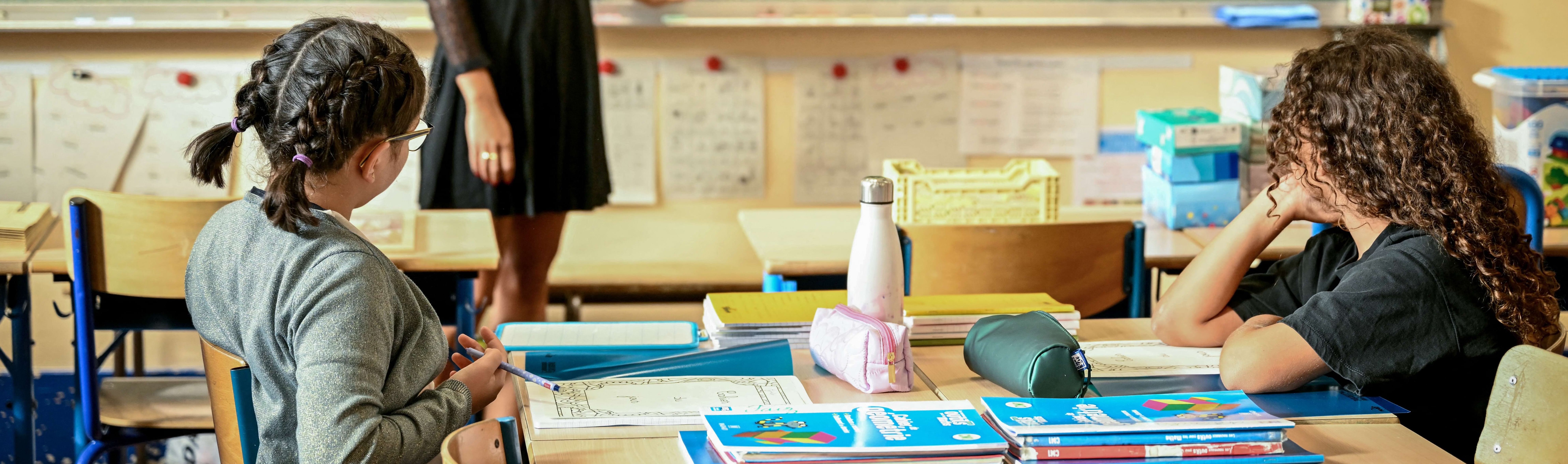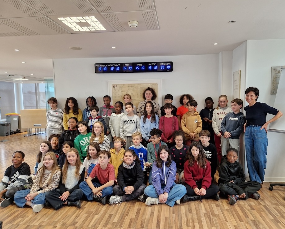 Photo : Jade Azzoug Montané, responsable des projets d’éducation avec les élèves de deux classes de CM2 de l'école République à Paris, novembre 2024.
